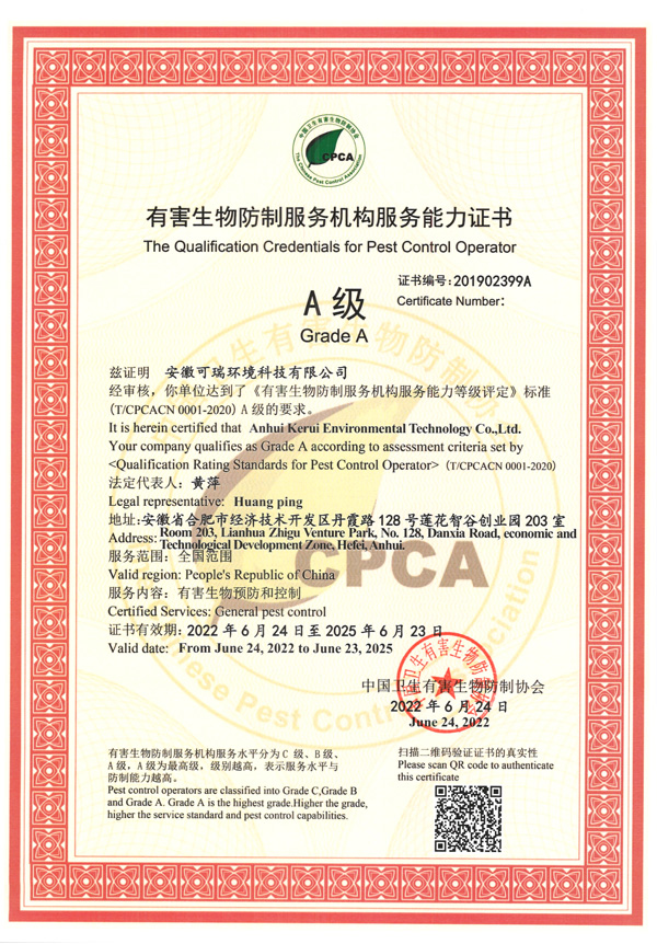 凱瑞蟲(chóng)控是安徽可瑞環(huán)境科技有限公司旗下品牌,安徽可瑞環(huán)境科技有限公司成立于2014年,注冊(cè)資金500萬(wàn)元,全國(guó)A級(jí)資質(zhì),致力于蟲(chóng)害風(fēng)險(xiǎn)管理并提供蟲(chóng)害消殺、防疫消毒、有害生物防制、蟲(chóng)害控制管理與監(jiān)測(cè)、衛(wèi)生防疫消毒、商業(yè)清洗清潔服務(wù)、空氣治理服務(wù)、環(huán)境綠化施工與養(yǎng)護(hù)、藥品和器械銷(xiāo)售、技術(shù)咨詢(xún)與培訓(xùn)等業(yè)務(wù)的服務(wù)性公司。公司是一家有行業(yè)資質(zhì)、注冊(cè)商標(biāo)及專(zhuān)利的公司。我們不參與各種擾亂市場(chǎng)秩序的低價(jià)競(jìng)爭(zhēng),堅(jiān)持以合理的價(jià)格、新穎的設(shè)備、優(yōu)質(zhì)的技術(shù)、完善的質(zhì)保體系和質(zhì)保措施,來(lái)對(duì)客戶(hù)進(jìn)行綜合的服務(wù)工作。公司本著...